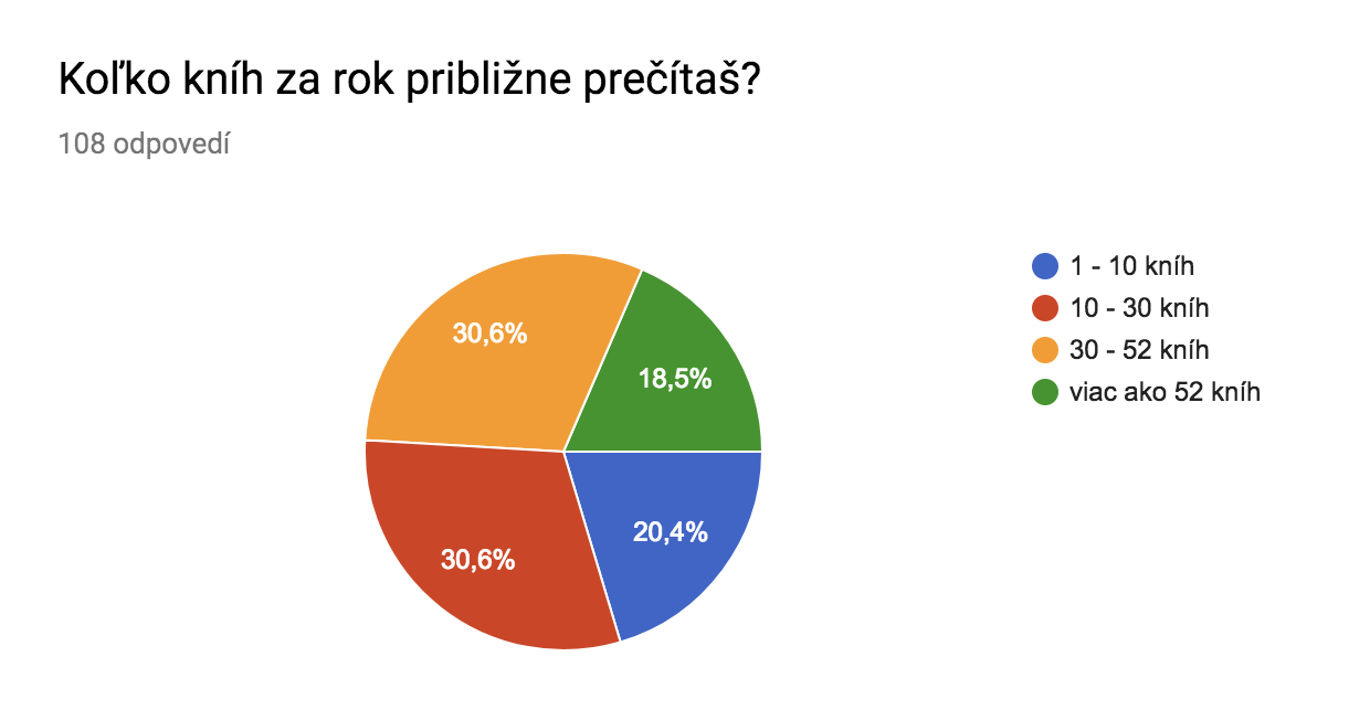- Je celkom logické, že čitateľmi blogu sú ľudia so záľubou v čítaní. Každý piaty prečíta viac ako 52 kníh za rok (čiže 1 týždenne)! A každý tretí minimálne 30 kníh. Riadni knihomoľovia, čo poviete?