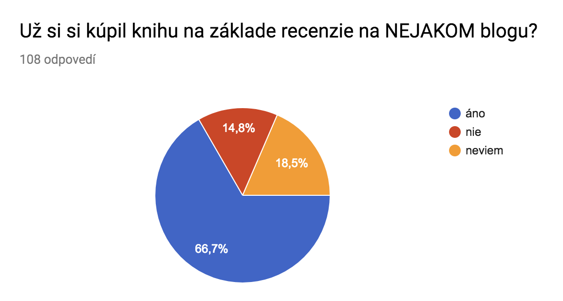 - Až tretina (!!!) zapojených do prieskumu tvrdí, že z knižných blogov číta len môj. To mi úplne vyrazilo dych!