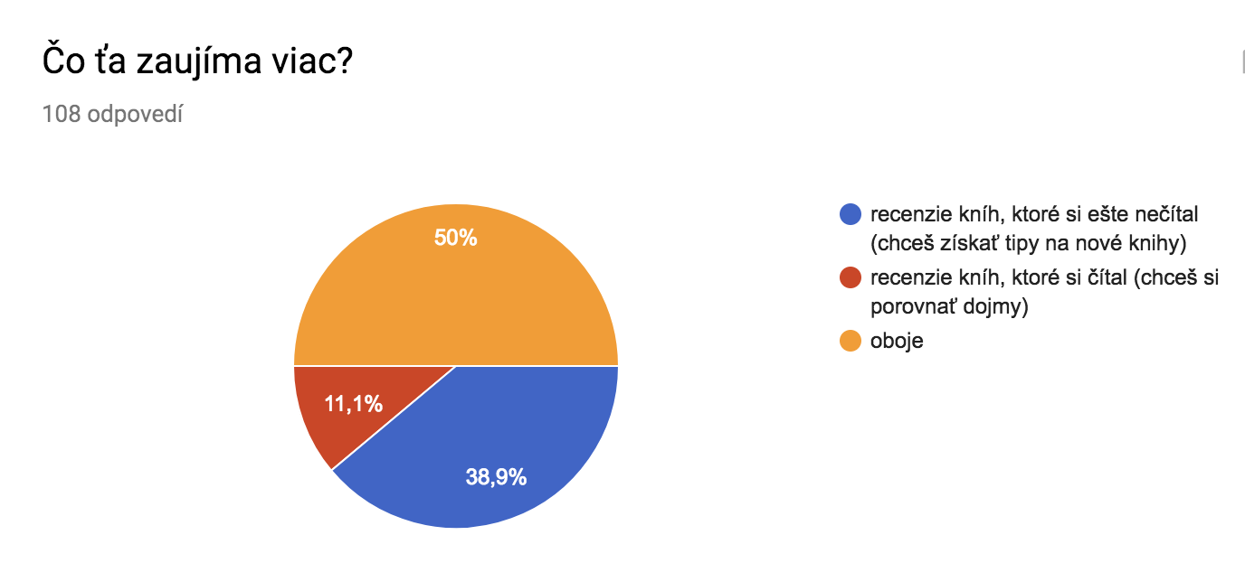 - Vzorku 108 odpovedí považujem za celkom reprezentatívnu. K vyplneniu som sa snažila maximálne motivovať – súťažou o poukážku do Martinusu či pestrým výberom výherných kníh, blogpost som podporila aj reklamou na Facebooku či banneríkom na blogu. Bez toho, aby som dala do súťaže zlatý vlas Dana Browna alebo identitu Dominika Dána by som asi viac nedosiahla.